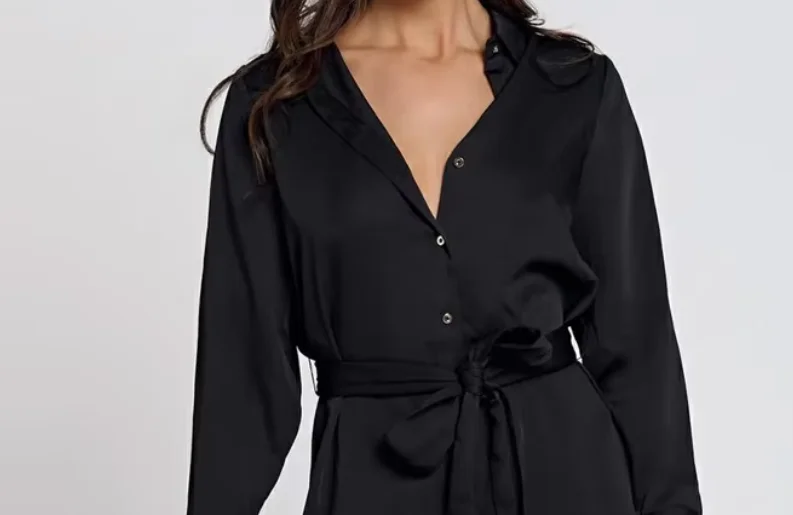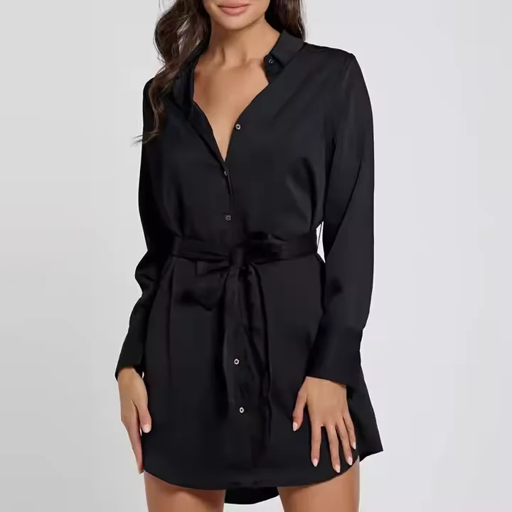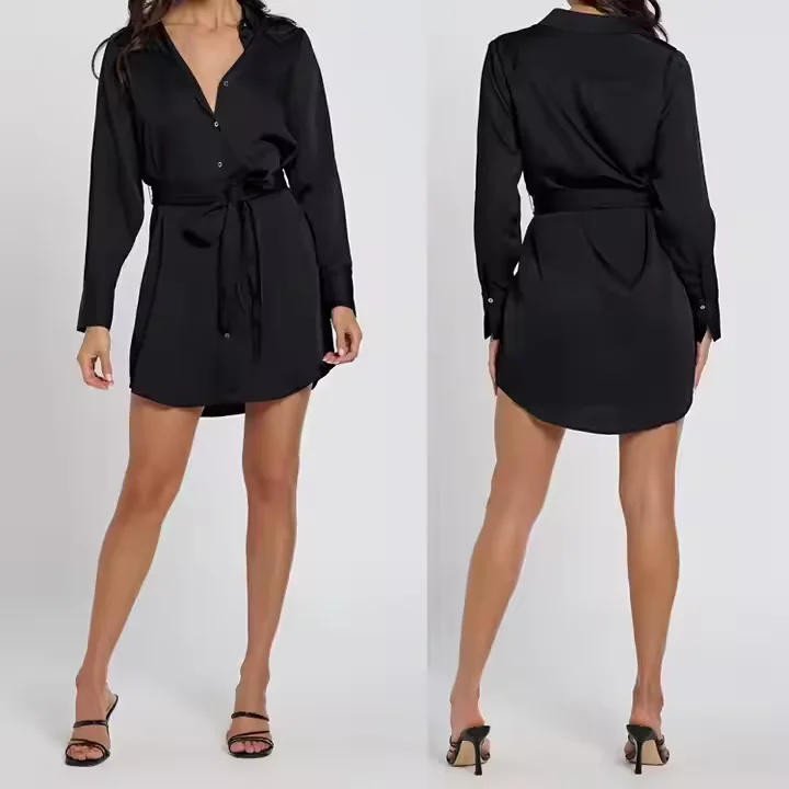 Women's Bohemian Solid Black Mini Dress Gold Embroidered Button Shirt Detachable Eco-Friendly Natural Belt Breathable for